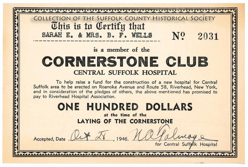 “To help raise a fund for the construction of a new hospital for [the] Central Suffolk area to be erected on Roanoke Avenue and Route 58, Riverhead, New York, and in consideration of the pledges of others, the above-mentioned has promised to pay to Riverhead Hospital Association, One Hundred Dollars at the time of the Laying of the Cornerstone.”